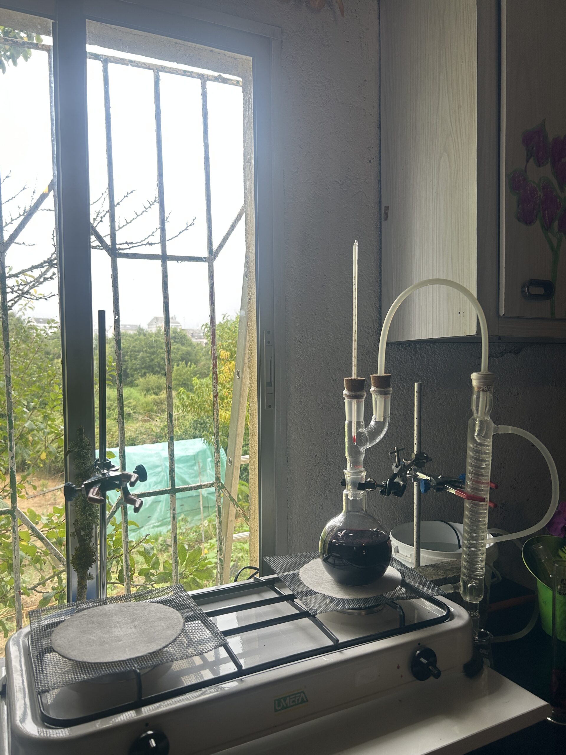 Once the boiling point was reach for ethanol (76-78ºC), clear liquid began to drop into the graduated cylinder.