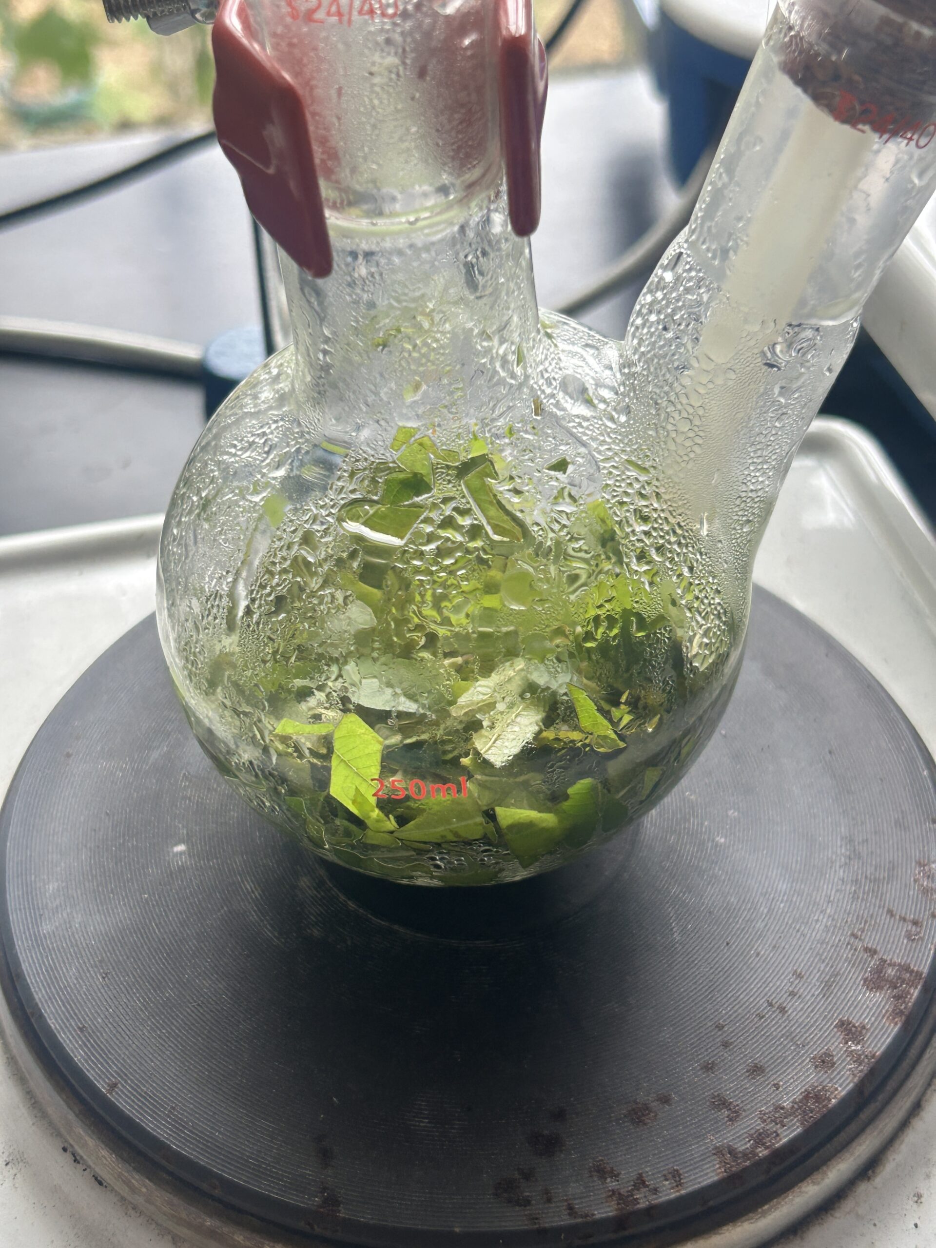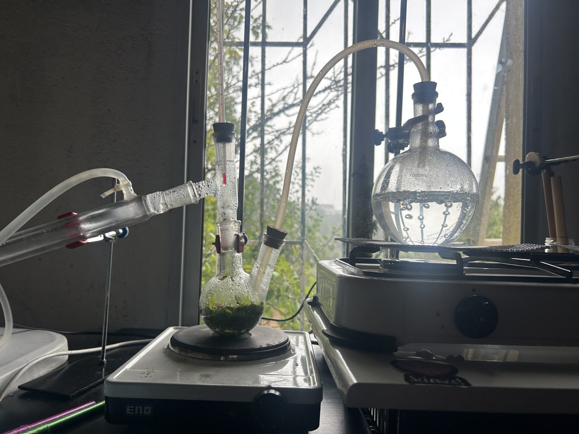In our case, we extracted essential oil from different plants. Explanation of the apparatus and how it works:
