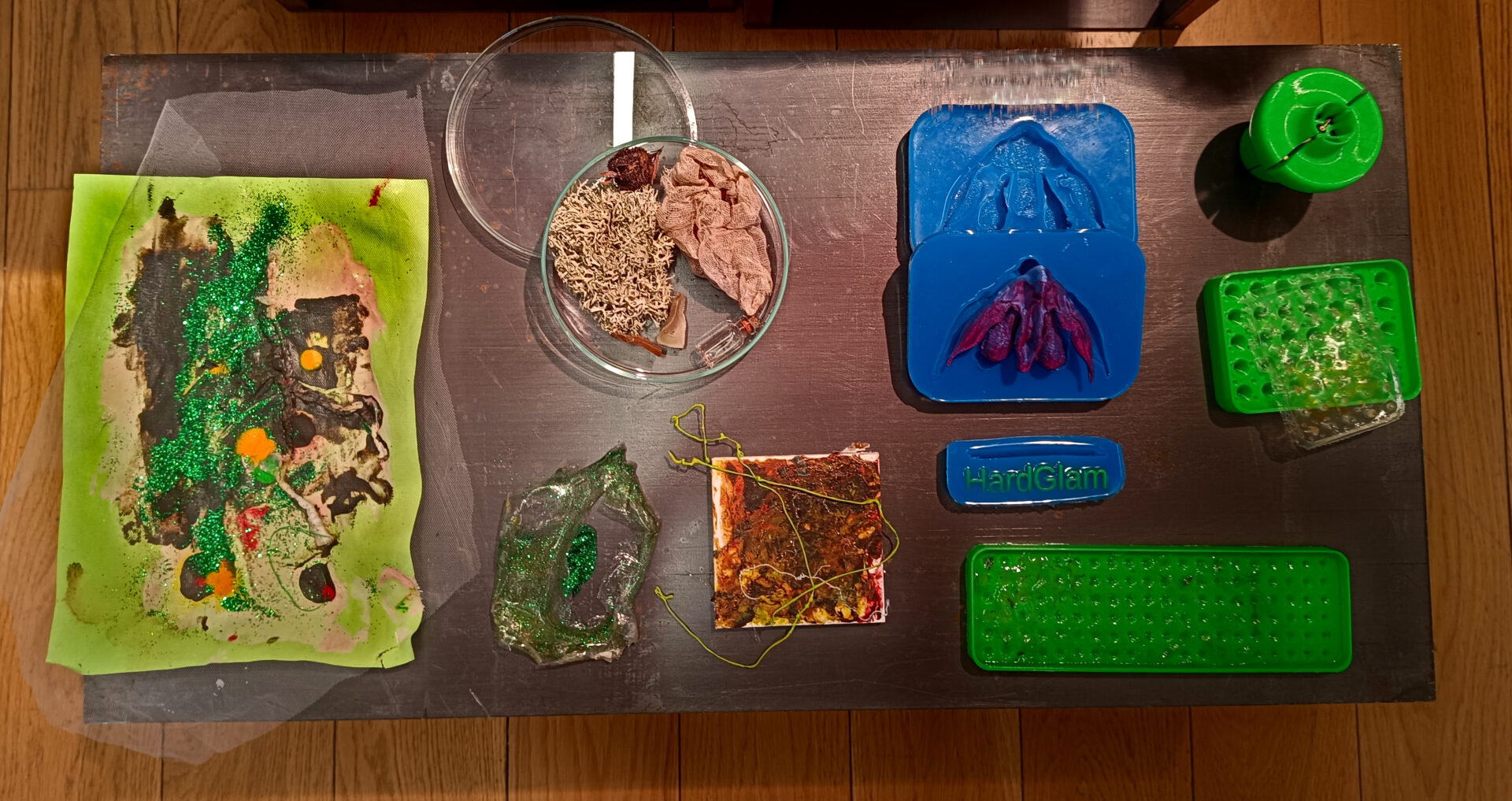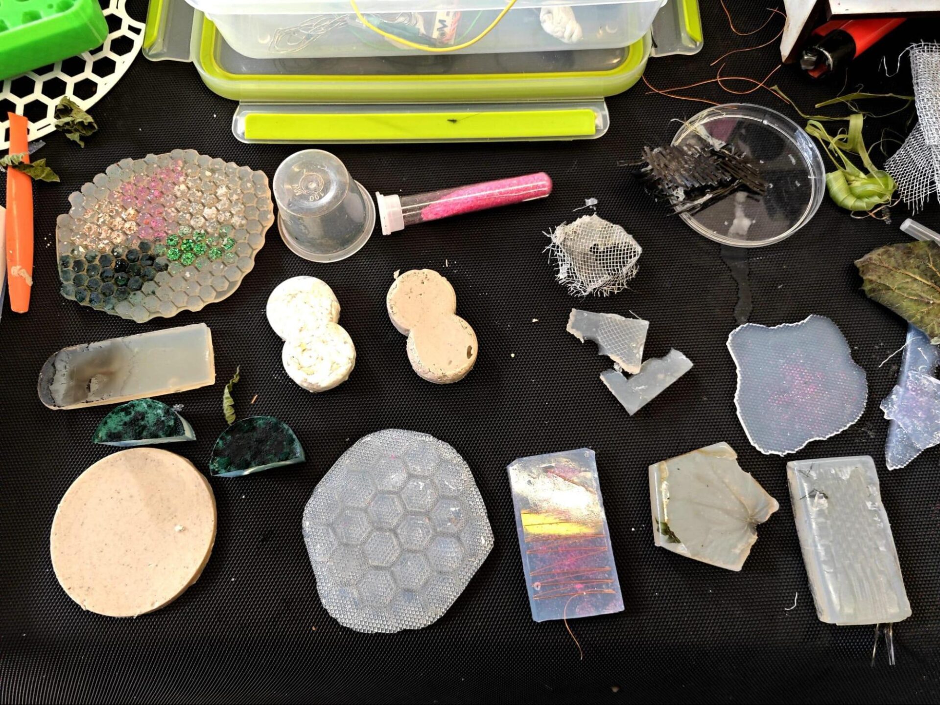Those who joined were a very nice group of people, many with expertise in their own fields, and demonstrations and spontaneous sharing started immediately. Short presentations and initiating workshops set a creative and playful spirit. The cooking and experimenting started and did not stop for the entire two days. Many variations of protocols and different ways of casting and forming were tested. Miranda, Urs and Tina swapped some very insightful protocols, which inspired them in their respective fields of fashion design and bio-electronics. A veritable collection of new samples and wonderful creations emerged. Urs and Miranda, for instance, were interested in how to develop sustainable materials for electronics, and spent some time trying to cast hydrophobic nanostructures from the natural world, as well as casting bioplastics, along with salvaged copper wire, into forms that would give them electro-mechanical properties (i.e. soft robotics and energy harvesting applications). On the second day, the topic of Do-It-Yourself microscopy was added and allowed the investigation of plants and materials. Satisfied with what we had achieved, we had to leave on the third day, which was still ongoing, and we hope to come back soon.